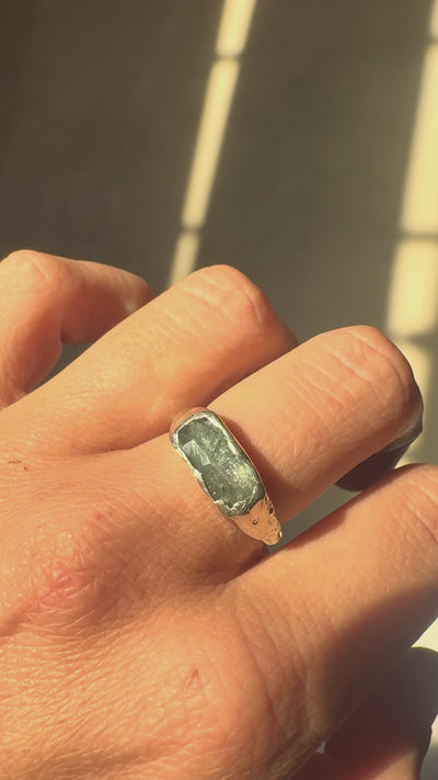 Sea blue kyanite set in an organic flowing sterling silver signet ring. When the light catches this stone it is stunning! Reminds me of the colours of the glacial lakes high up in the Huayhuash mountain range i recently trekked in Peru.