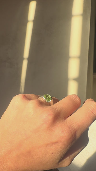 Juicy 1.9 carat green tourmaline signet style ring with an open setting that lets light into the stone for extra sparkle!