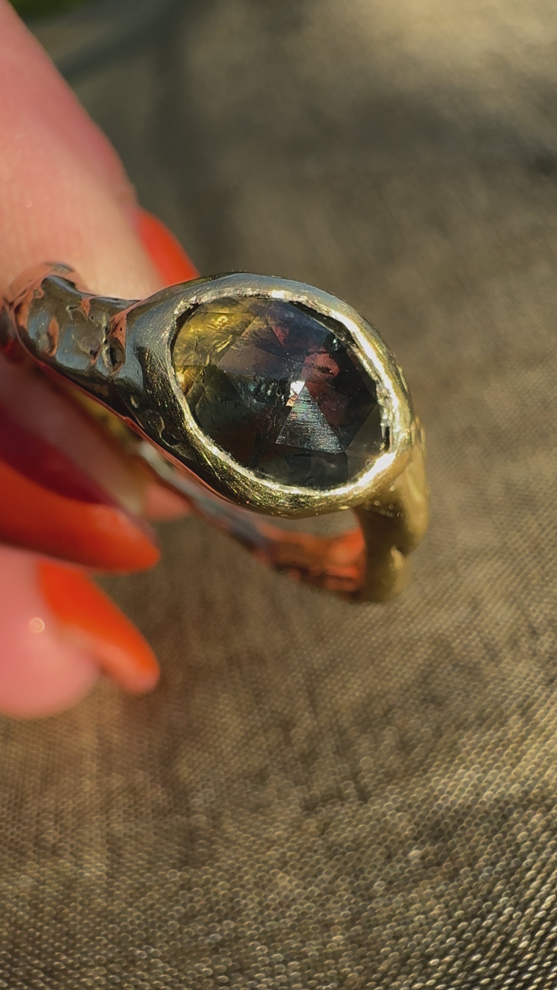 The Nyla ring features a deep bicolour sapphire set in an organic asymmetric band, almost resembling an eye. This is a dark stone that is gorgeous when the light catches showing off its blue and yellow divide with dark inclusions flowing through it. One of a kind.